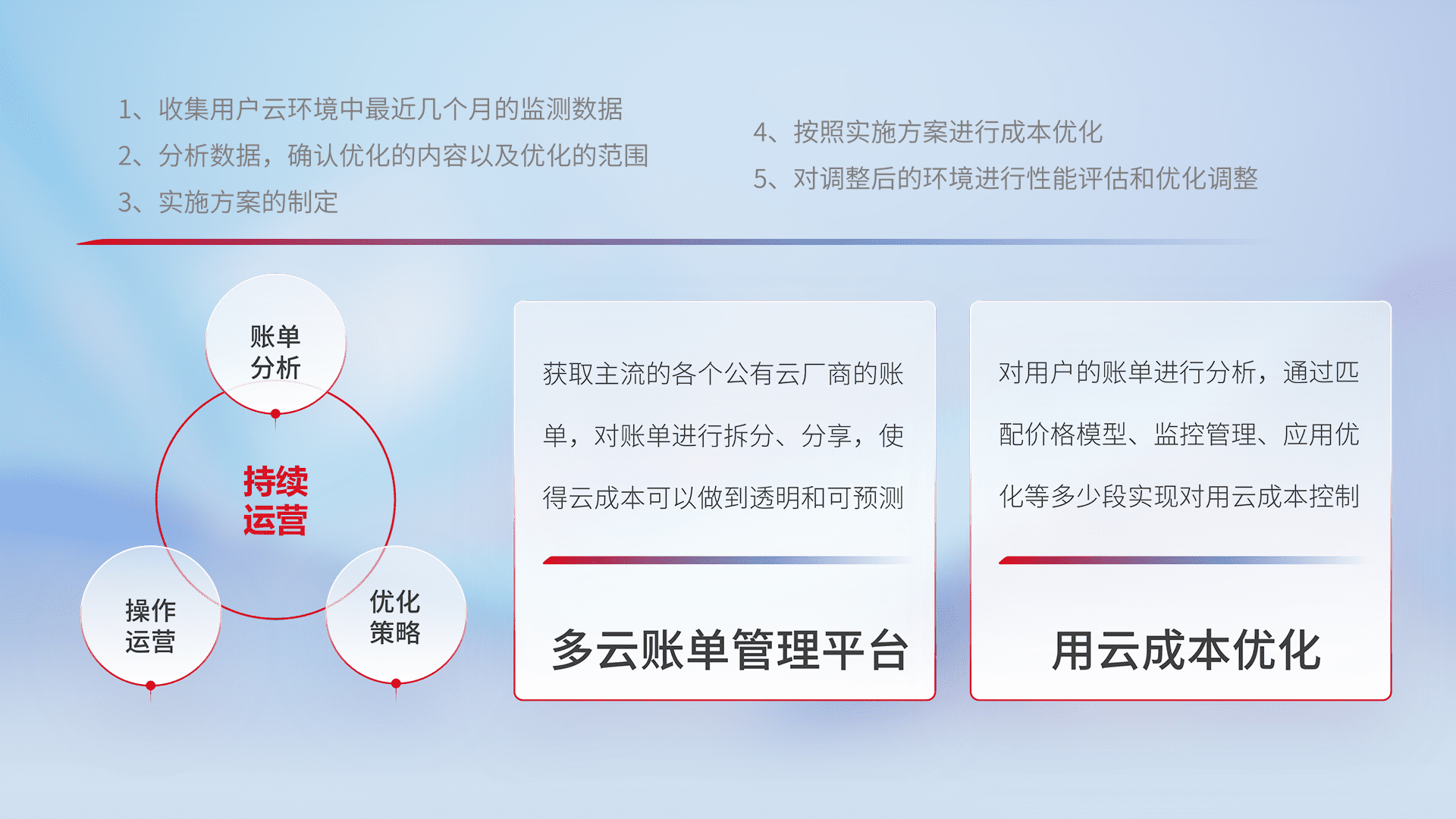 通过多云纳管,,以统一的资源数据模型把客户的云资源进行抽象和封装,,,进而实现对多云资源的统一操作,,,,保障云资源管理的可靠性、、、、稳定性与可用性。。。。量身定制化运维内容,,配置、、、、开发运维、、、补丁管理、、、、备份、、、、监控、、认证和访问管理、、审计和日常巡检等,,,,保障在用云过程中的可靠度,,稳定度以及高可用率。。。